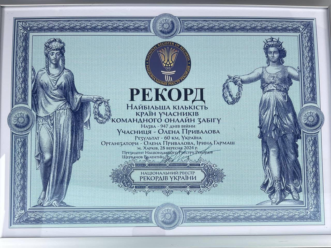 Команда бігунів аматорів під керівництвом тренерки Привалової Олени та реабілітологині Гармаш Ірини в загальному заліку пробігла 1200 км. Підготовка до рекорду України тривала цілий рік. У планах було подолати 947 кілометрів, рівно стільки днів війни було в день встановлення рекорду. Команди бігли в різних країнах та містах: Україна, Іспанія, Німеччина, Норвегія, Фінляндія, Чехія, Польща, Англія, Португалія та Швейцарія. Так,сьогодні директор Департаменту у справках сімʼї, молоді та спорту Харківської міської ради Олександр Власенко вручив Почесні грамоти Департаменту: Приваловій Олені, Гармаш Ірині, Добровольській Галині та Добровольскому Володимиру. Майже всі учасники починали з нуля, не маючи бігового досвіду, але за рік підготовки встановили особисті рекорди, пробігши дистанції ультрамарафонів, марафонів та напівмарафонів. Першими стали родина Добровольських. Галина та Володимир, кожен з яких подолав 70 км. Привалова Олена, тренерка команди, стала Рекордсменкою України в особистому заліку, пробігши 60 км у категорії -3 група інвалідності.